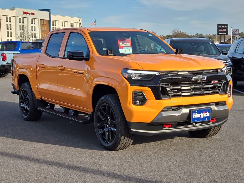 Blind Spot Monitor, Lane Keeping Assist, Cross-Traffic Alert, Child Safety Locks, Electronic Stability Control, 4-Wheel ABS, Tire Pressure Monitoring System, 4-Wheel Disc Brakes Chevrolet 4WD Z71 with Sunrise Orange exterior and Jet Black/Adrenaline Red interior features a 4 Cylinder Engine with 310 HP at 5600 RPM*.