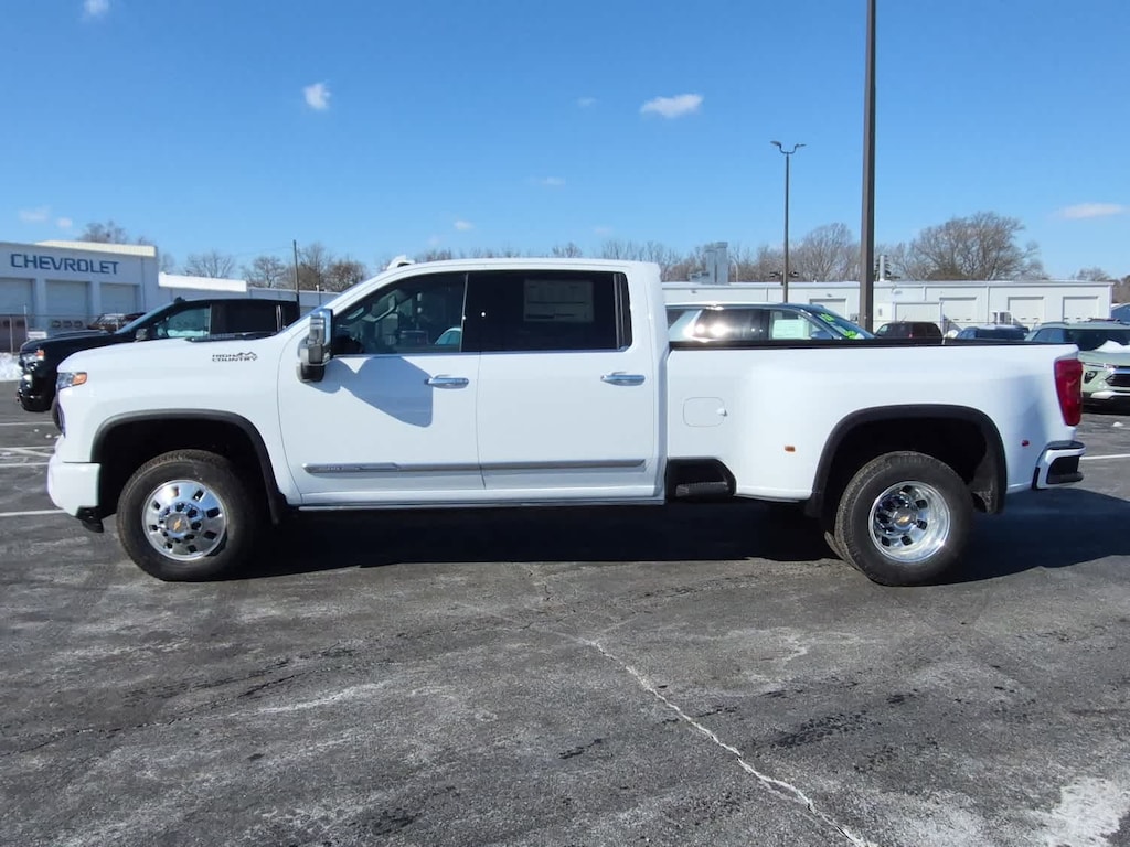 ENGINE, DURAMAX 6.6L TURBO-DIESEL V8, B20-DIESEL COMPATIBLE (470 hp [350.5 kW] @ 2800 rpm, 975 lb-ft of torque [1322 Nm] @ 1600 rpm), ASSIST STEPS, POWER-RETRACTABLE, WITH BRIGHT TRIM includes LED lighting, TECHNOLOGY PACKAGE includes (DRZ) Rear Camera Mirror and (UV6) 15" Diagonal Head-Up Display, GOOSENECK / 5TH WHEEL PREP PACKAGE -- Hitch platform to accept Gooseneck or 5th Wheel hitch. Includes hitch platform with tray to accept ball, stamped bed holes with removable caps installed and bed mounted 7-pin trailer harness (similar to UY2 harness). (Includes (CGN) Chevytec spray-on bedliner. TAILGATE, MULTI-FLEX with six functional load/access features, NOTE: Auto release can be disabled if ball hitch is installed. See Owner's manual for details, GVWR, 14,000 LBS. (6350 KG) WITH DUAL REAR WHEELS, AUDIO SYSTEM, CHEVROLET INFOTAINMENT 3 PREMIUM SYSTEM with Google built-in compatibility (select service plan required, terms and limitations apply) including navigation capability, 13.4" diagonal HD color touchscreen, includes multi-touch display, AM/FM stereo, Bluetooth® streaming audio for music and most phones; featuring Wireless Apple CarPlay® and Wireless Android Auto® capability for compatible phones, advanced voice recognition, in-vehicle apps, personalized profiles for infotainment and vehicle settings (STD), TRANSMISSION, 10-SPEED AUTOMATIC.